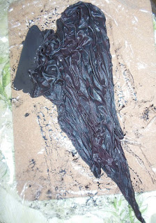 I wanted to create some texture on the wings that imitated feathers. So I took a fine chiffon scarf and dipped it in the black Powertex and gathered and manipulated it on the wings. I was pretty happy with the way they turned out.